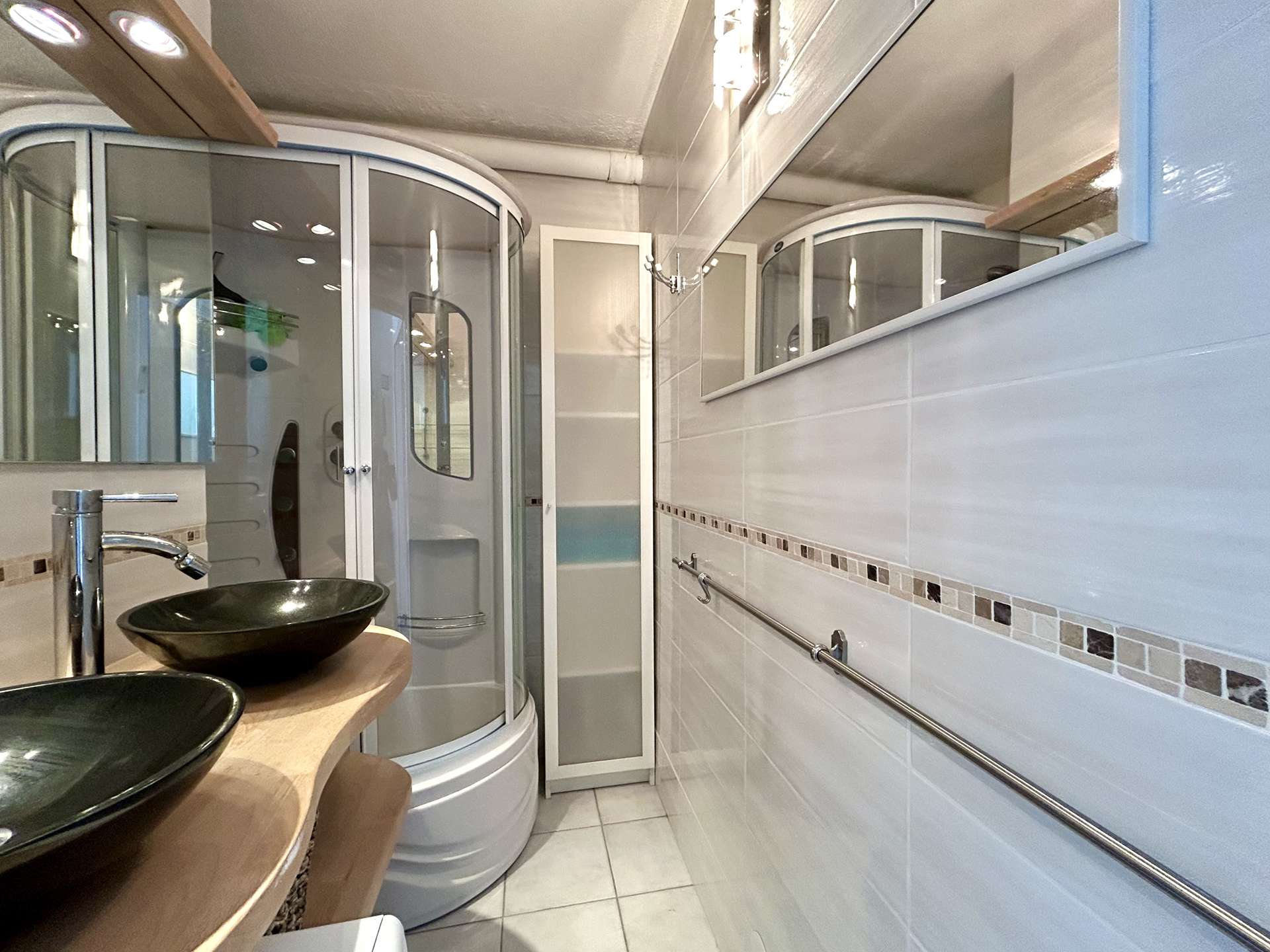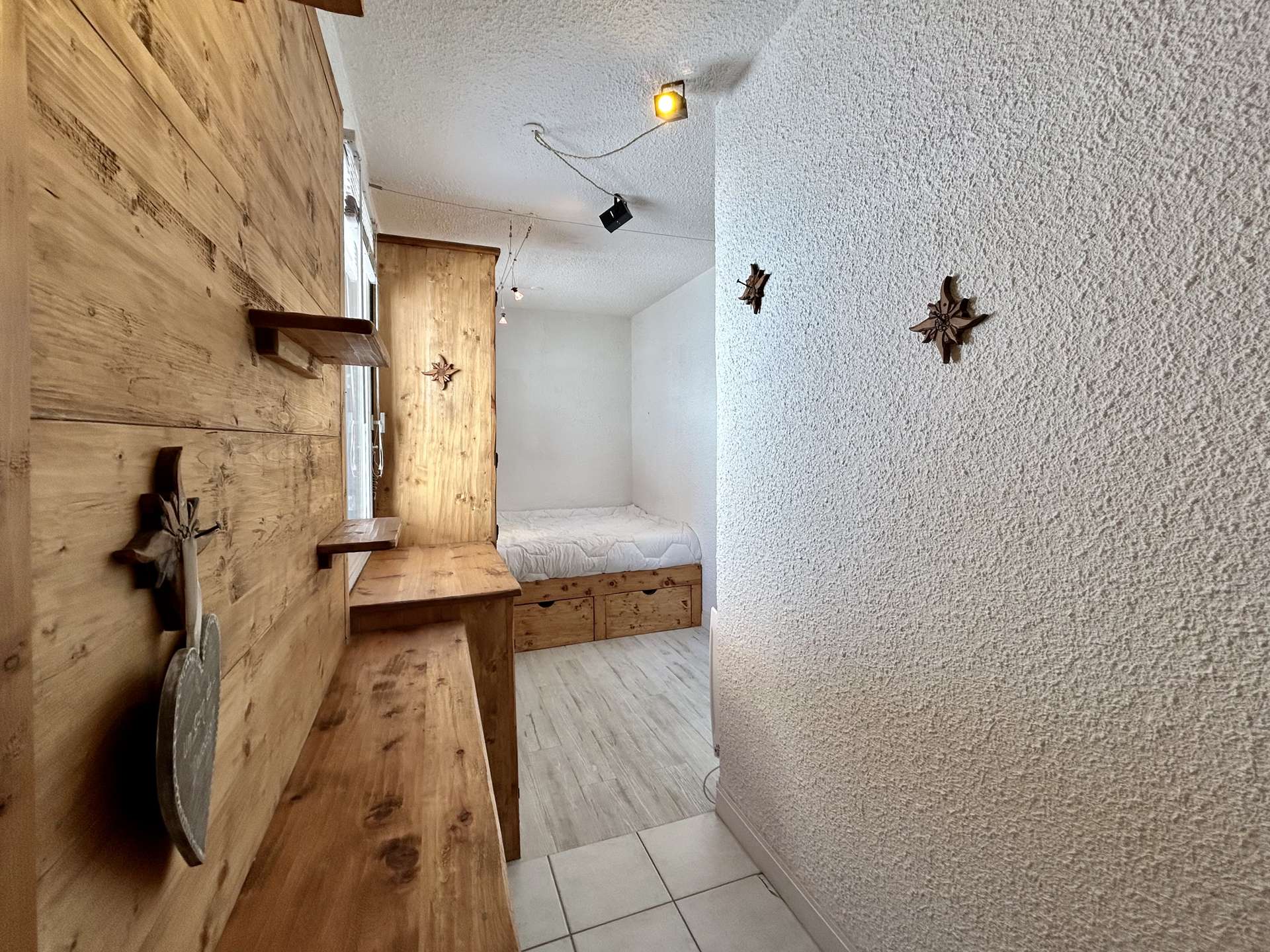 - an alcove located in the entrance, equipped with a double bed (140 × 190) and separated from the kitchen by a door.