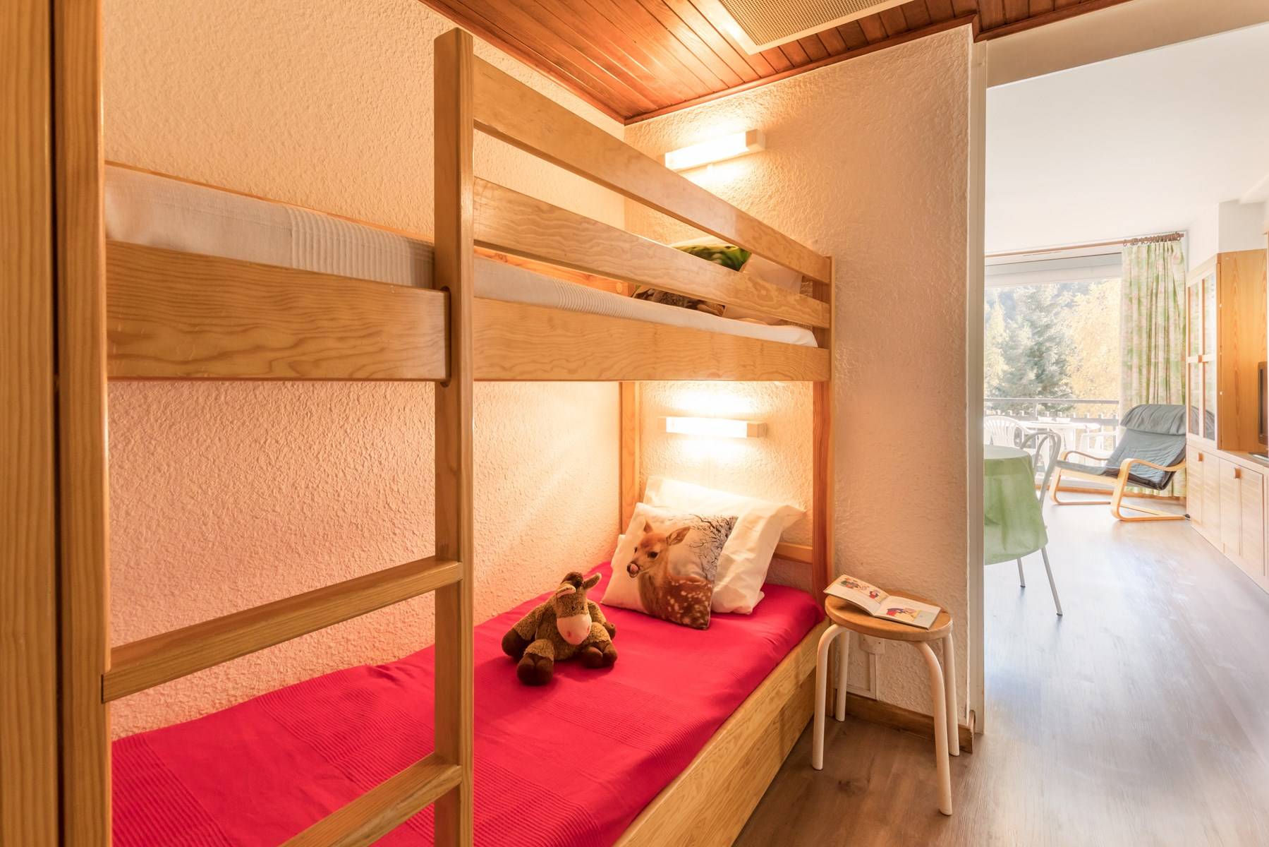 This apartment in the mountains includes a bedroom with a double bed, an alcove with bunk beds, a living room with a sofa bed for two people and a television, a kitchen area with a dishwasher and a microwave, a bathroom with washing machine and separate WC.