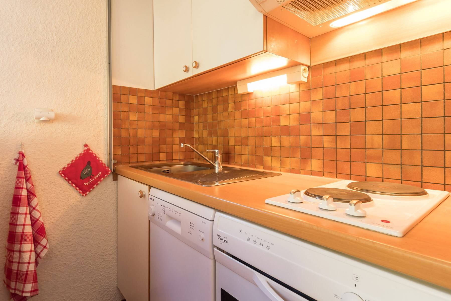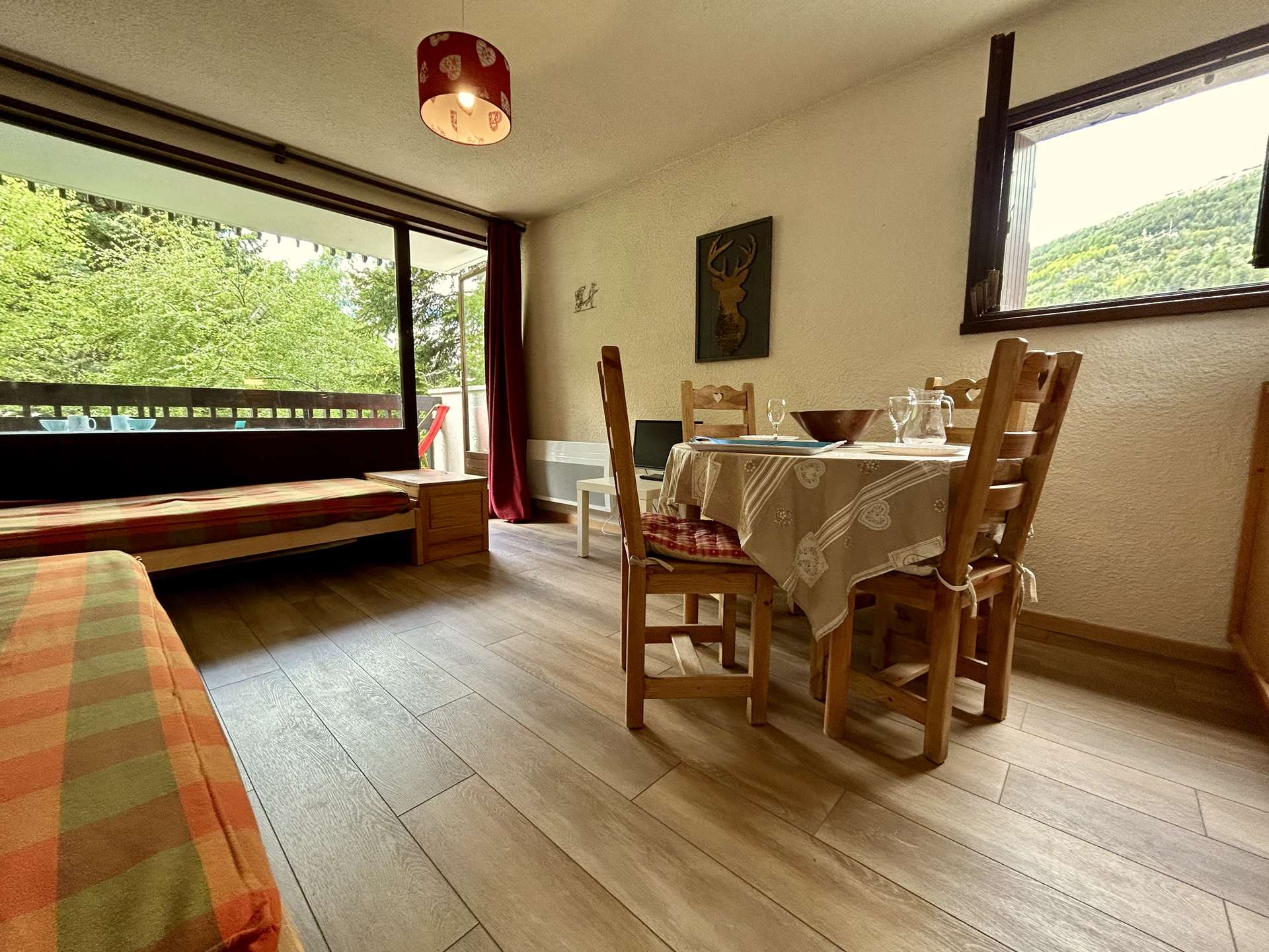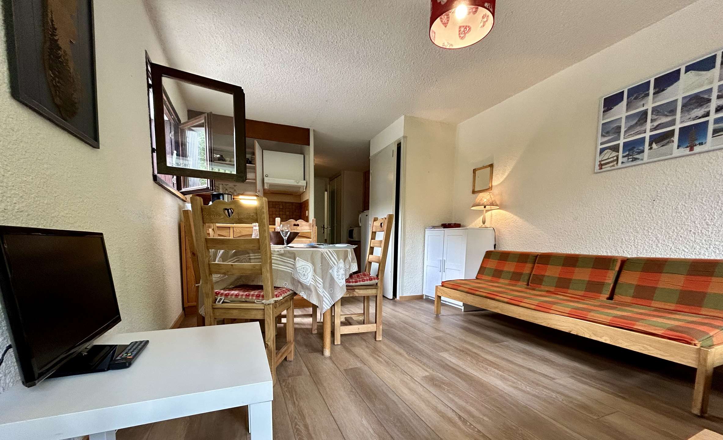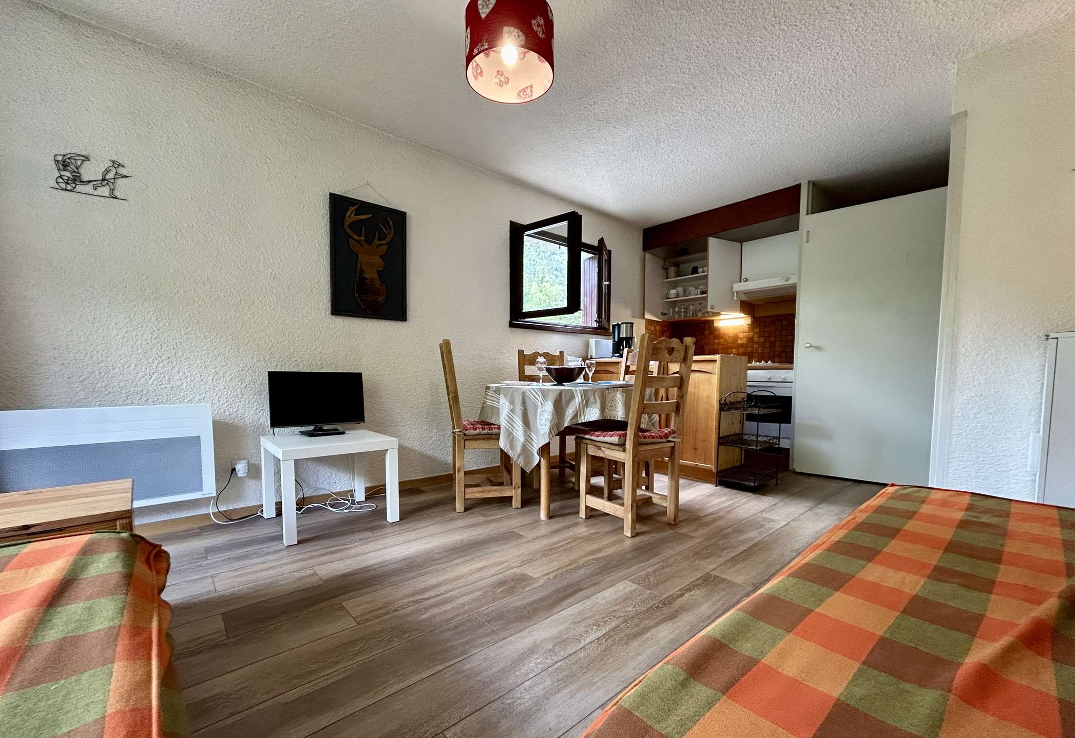 This studio for 4 people includes an alcove with 90 bunk beds, a living room with two 80 single beds and a television, a fully equipped kitchenette (dishwasher, microwave, oven, fridge, coffee maker), a bathroom and separate WC. Possibility to park your vehicle in the parking lot outside the residence.