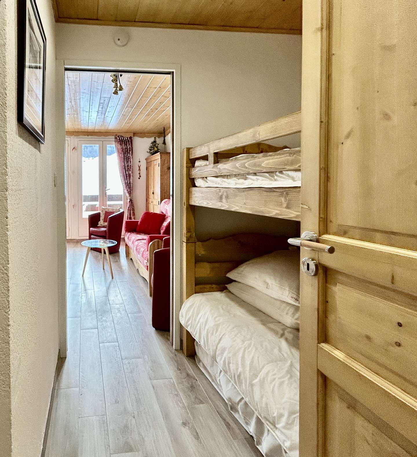 - two bunk beds in the hallway with sliding door,