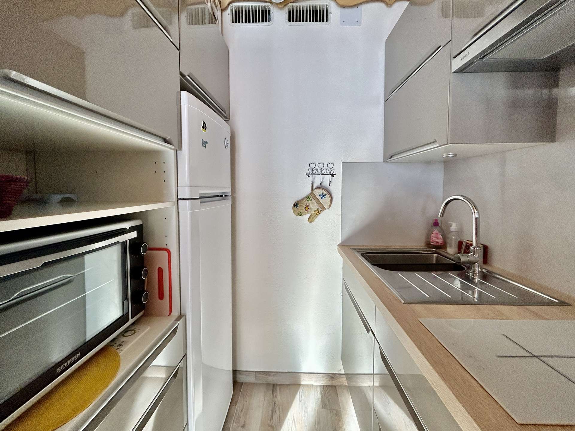 - a kitchen area with induction hob, microwave, oven, dishwasher, etc.;