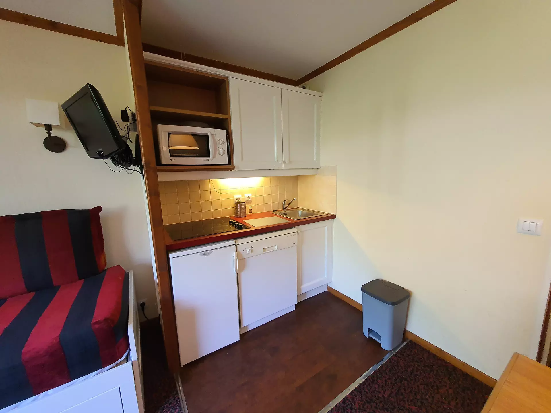 Fitted kitchen area with refrigerator, ceramic hob, dishwasher