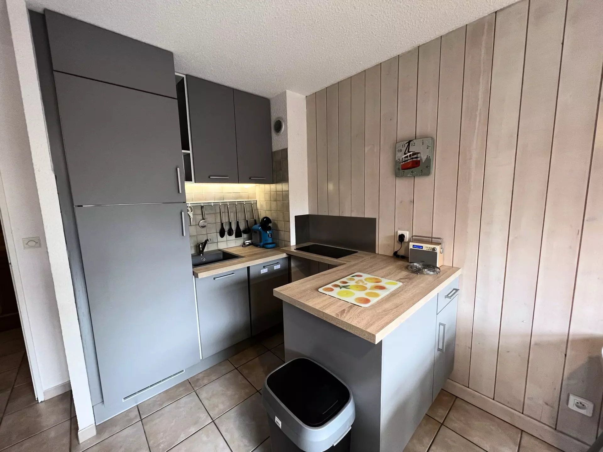 A kitchen area equipped with dishwasher, refrigerator, 2-burner ceramic hob, oven.