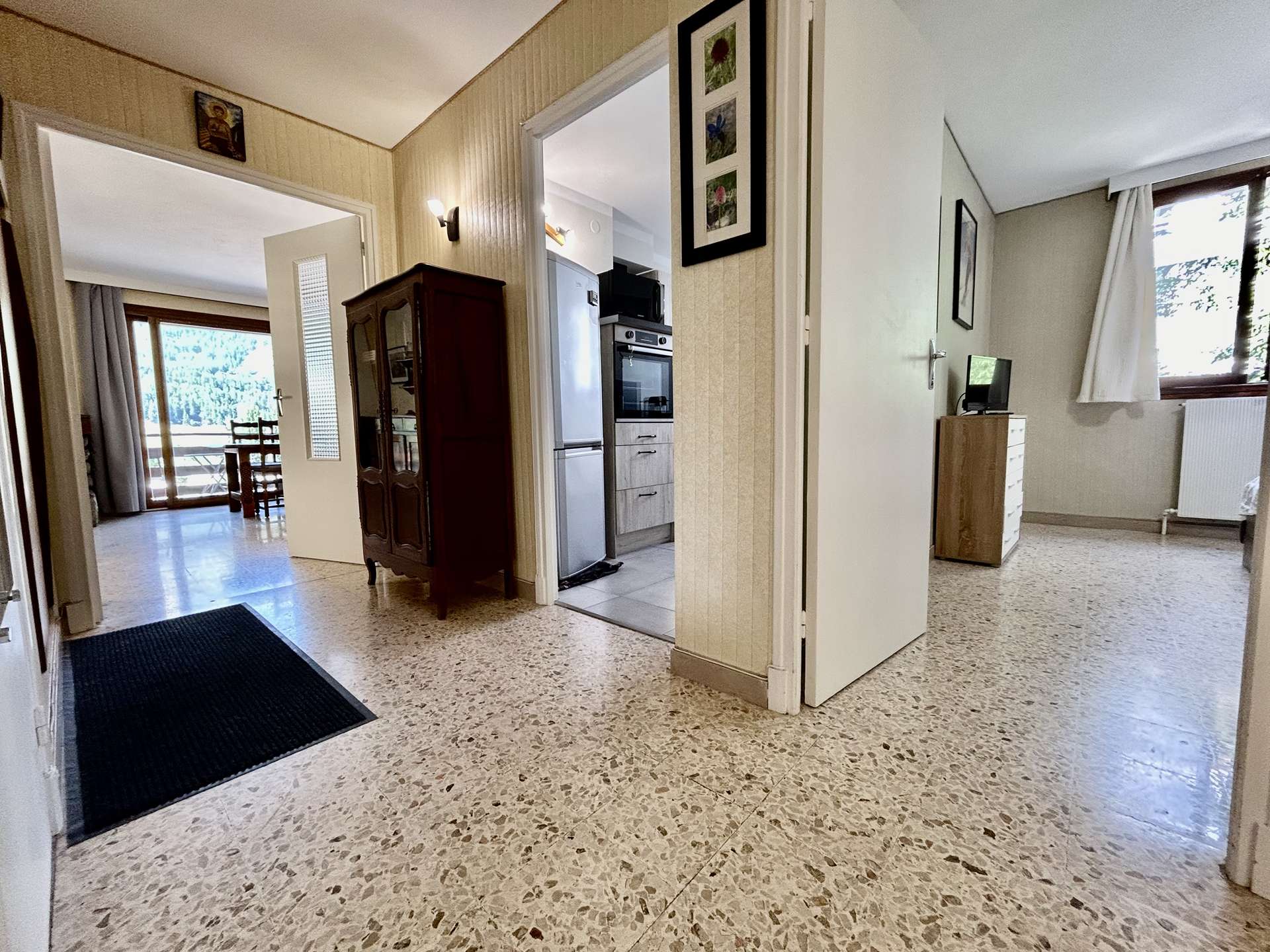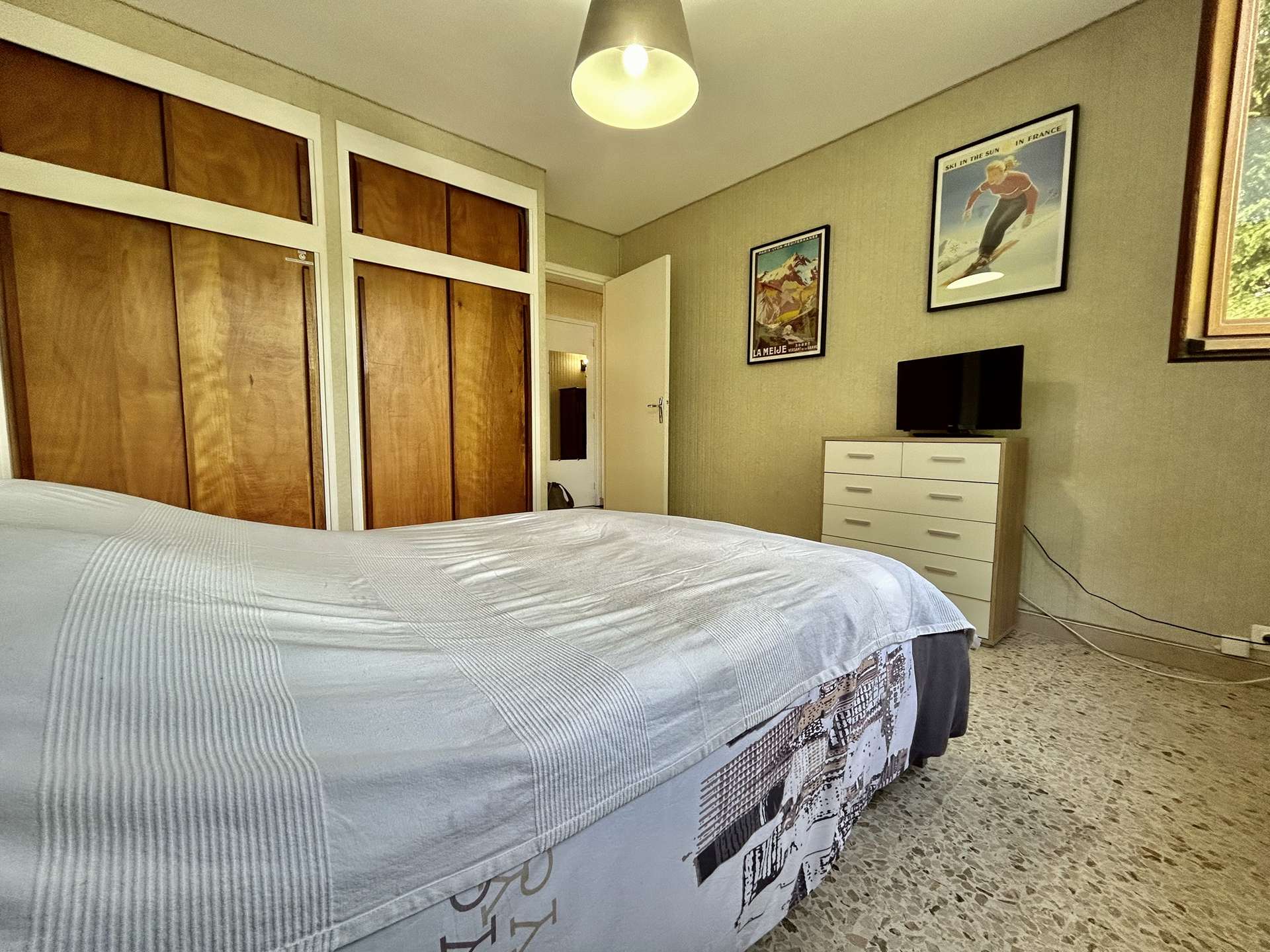 This three-room rental is arranged as follows: a bedroom with two single beds (which can make a 160 cm double bed) and opening onto a south-facing balcony, a bathroom, separate toilets and a double living room with balcony facing south. Part of the living room can be closed by a sliding door and offers a sleeping area equipped with a 140 rapido sofa for two people and bunk beds. The second part includes a living room with a sofa, a television, a dining area and a wood-burning stove.