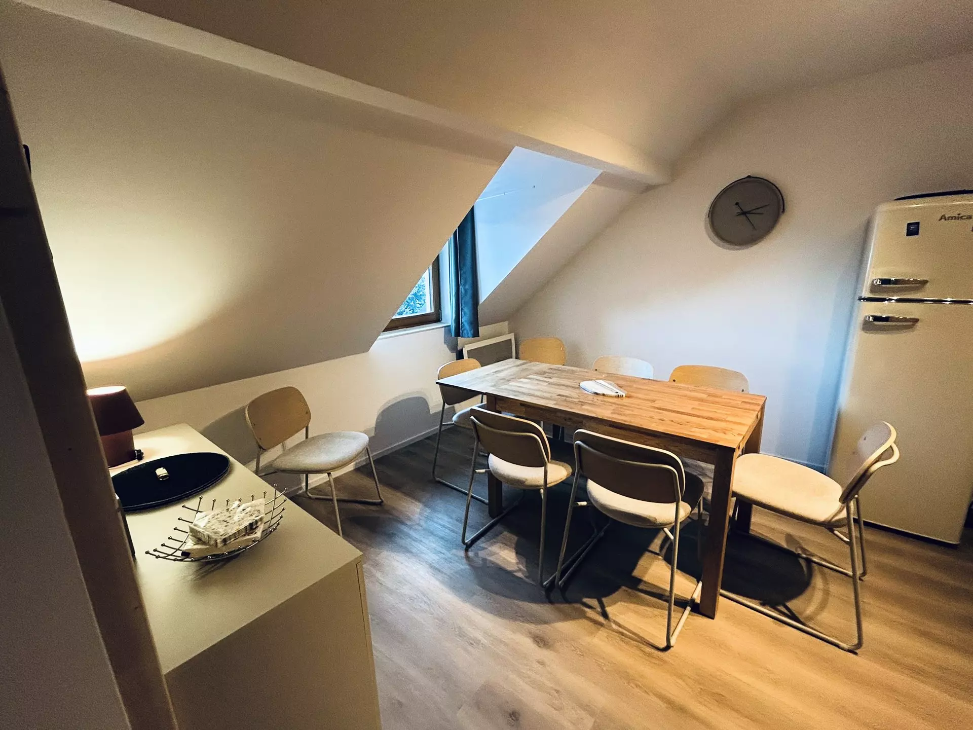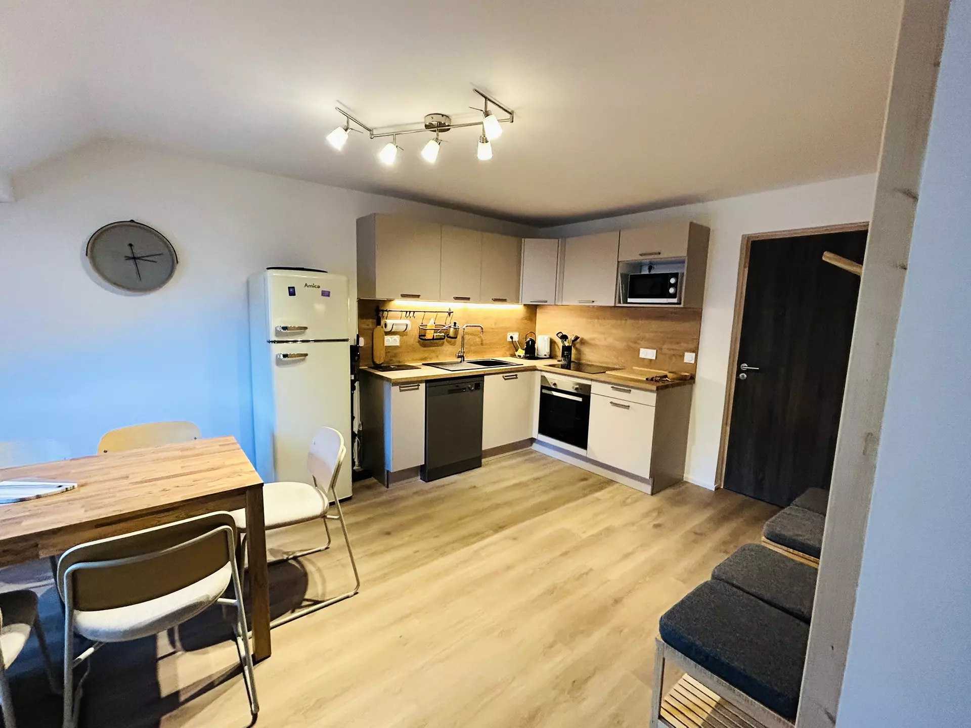 A kitchenette with refrigerator, dishwasher, oven, and ceramic hob.