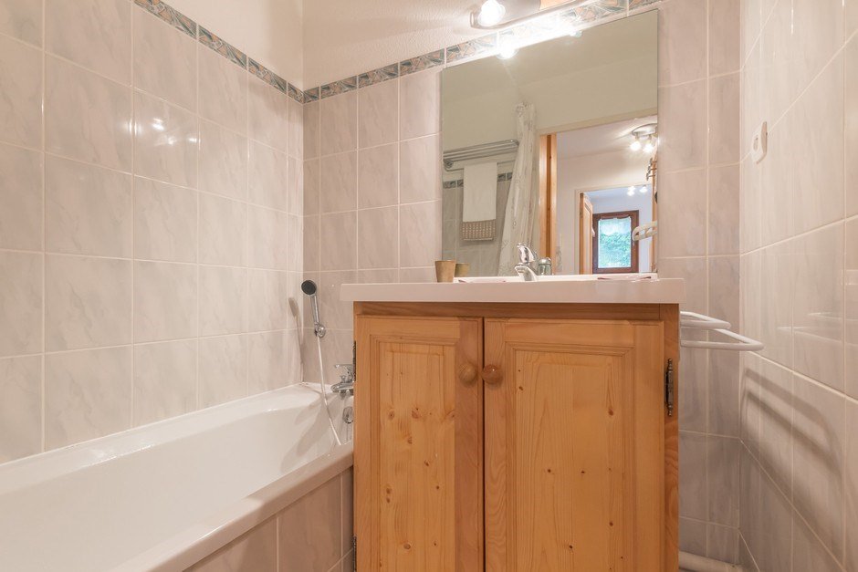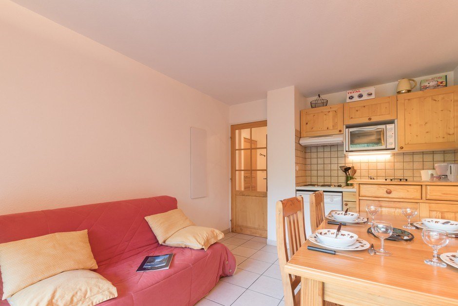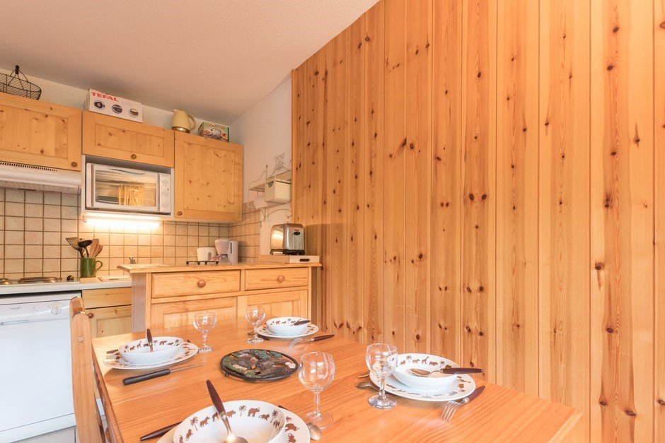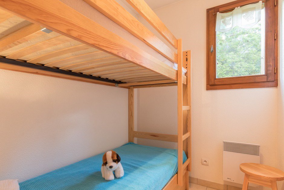 This two-room apartment accessible with a lift includes: - a bedroom with a 140 bed, - A closed cabin with a window and two bunk beds, - A living room with TV, no bedding - An equipped kitchen area - A bathroom - And a separate toilet - A ski locker garage.