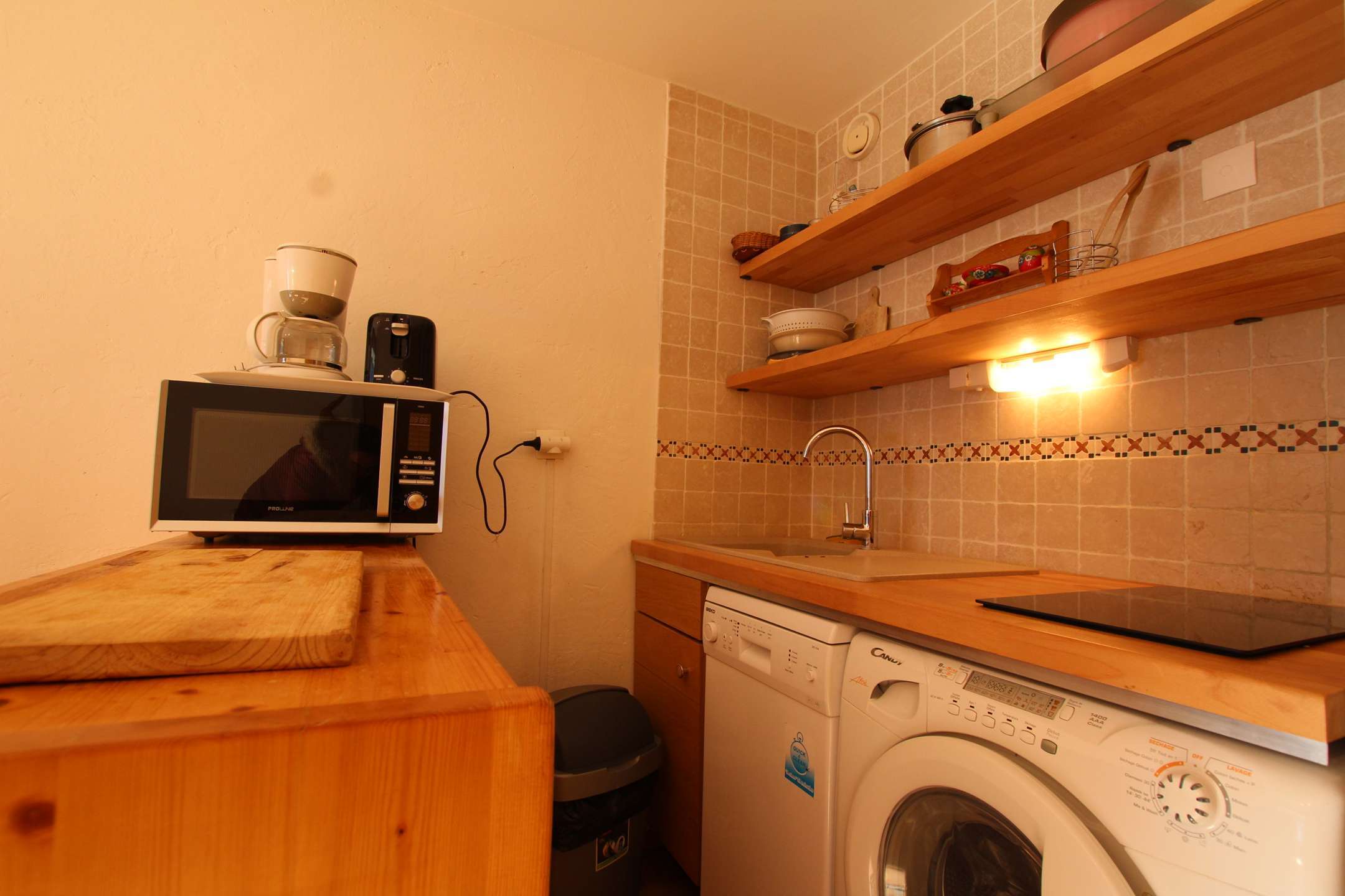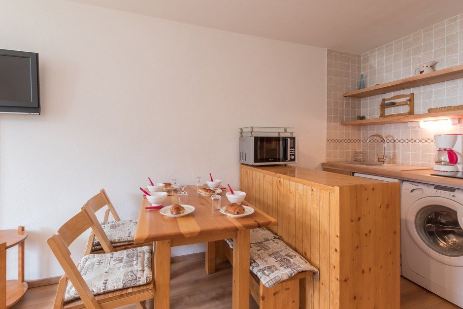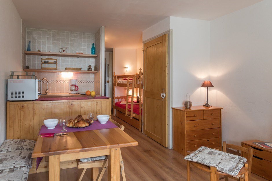 The studio includes: -An alcove with 2 bunk beds -A living room with a sofa bed for 2 people and an LCD TV -A small fitted kitchen -A bathroom with shower screen - separate wc - A balcony equipped with a table and 4 chairs.
