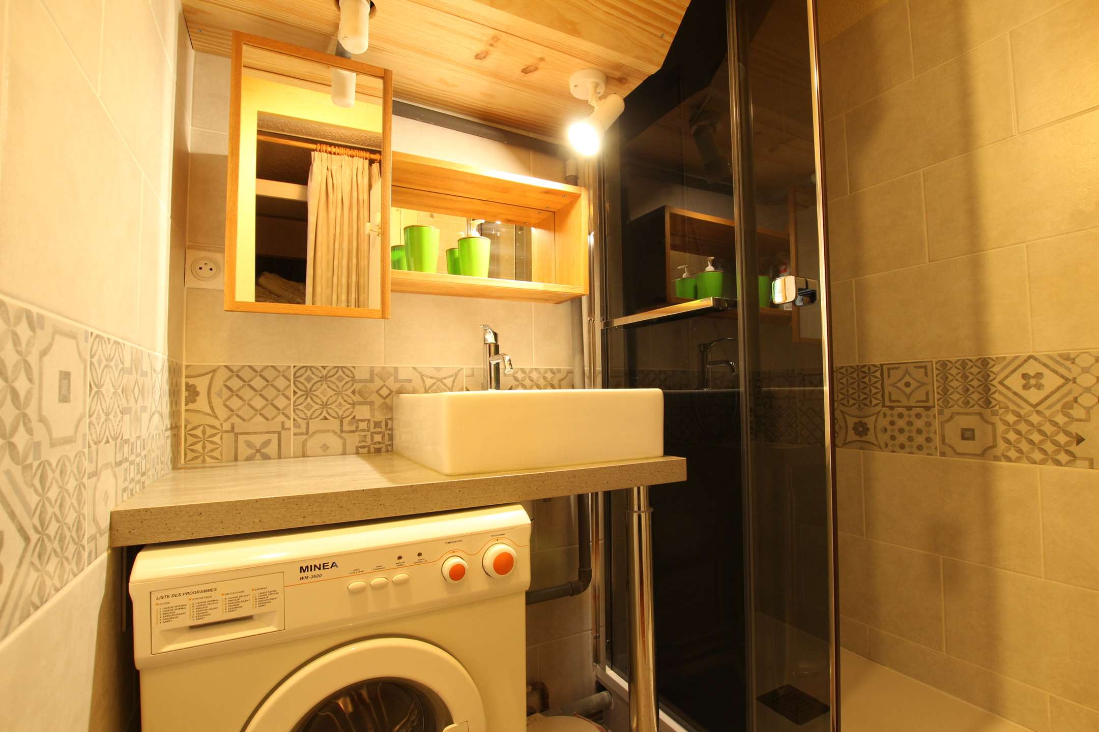 It includes: -A Mezzanine with a 140 cm bed + umbrella bed - A sleeping area with 2 single 80 cm beds -A living room with a BZ sofa bed for 2 people, and DVD+TV player - A fitted kitchen area - A bathroom with washing machine - And separate toilets -