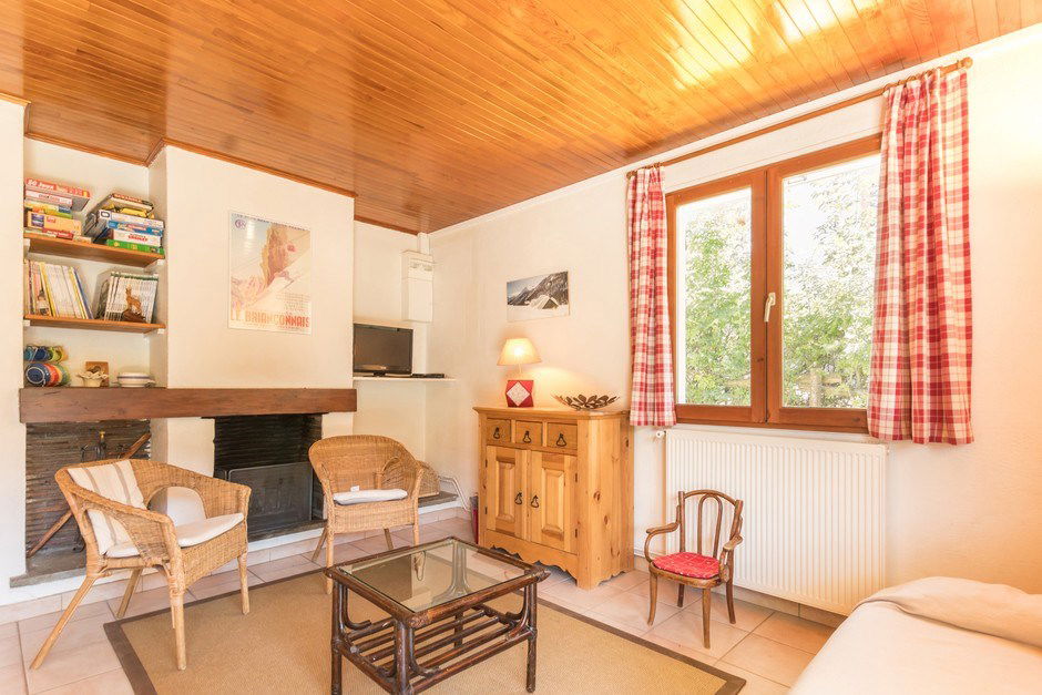 - A living room with fireplace (wood not provided), equipped with a BZ-style sofa bed for two people, a television and a south-facing equipped terrace.