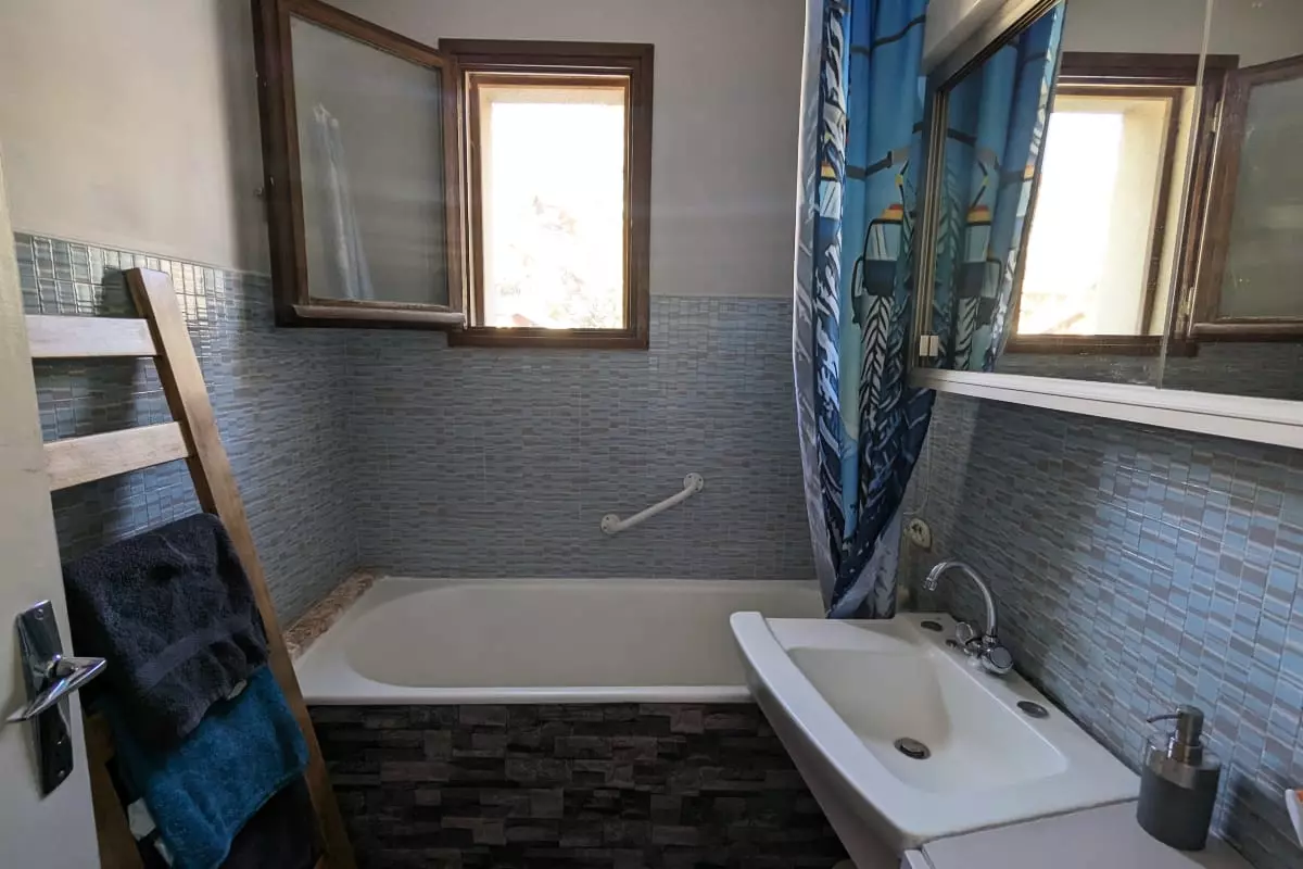 - and a bathroom with bathtub.