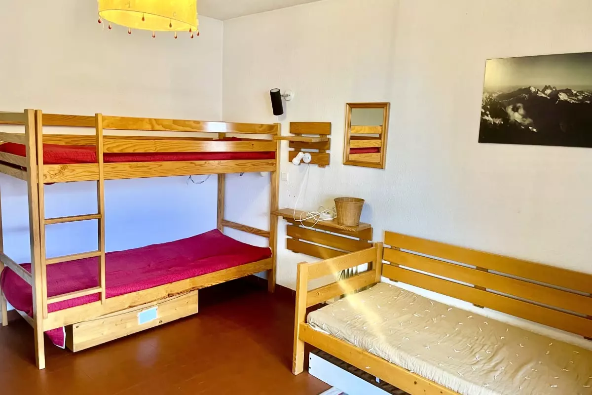 - a bedroom with a bunk bed and two single beds;